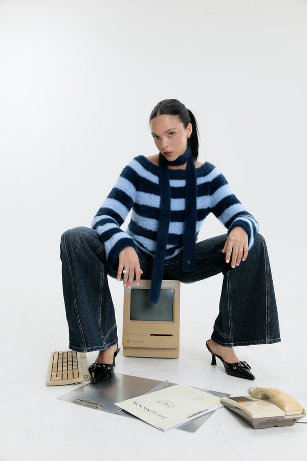 Luv Dept / Fluffy Stripes Sweater with Skinny Scarf - Blue