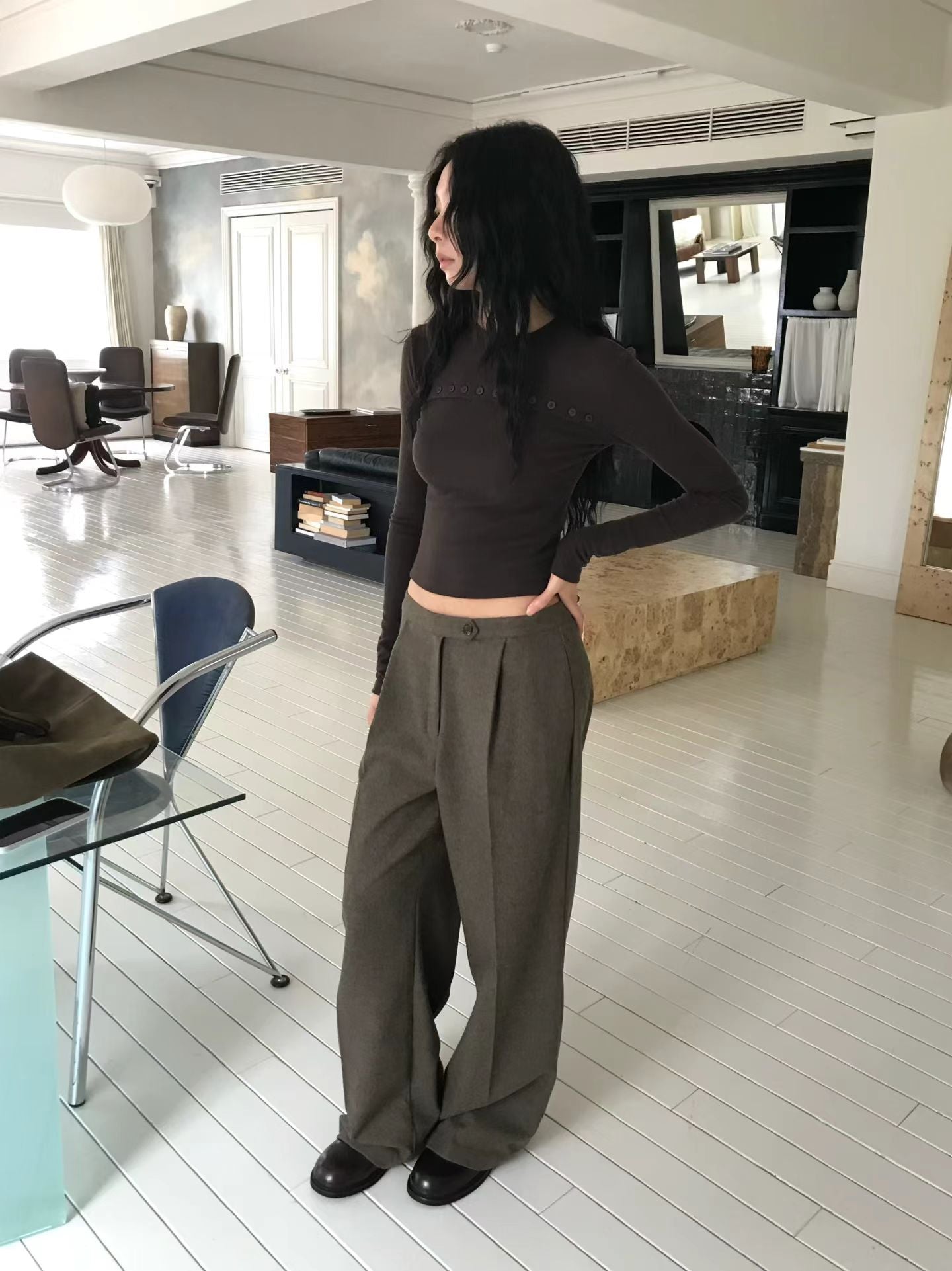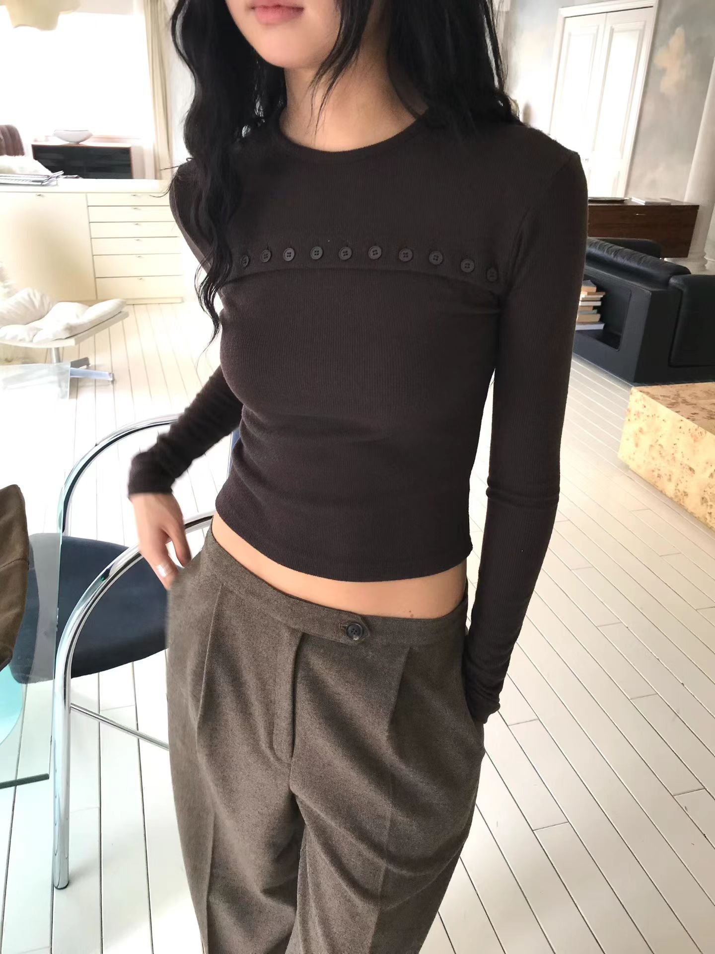 For minimalism enthusiasts, this long sleeve top delivers understated elegance through thoughtful design. The signature button-up chest detail transforms a simple silhouette into something distinctly refined. Crafted from soft cotton, it offers everyday comfort without compromise. Perfect for those who appreciate quality basics with subtle character.